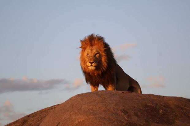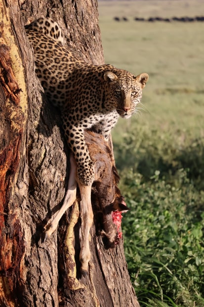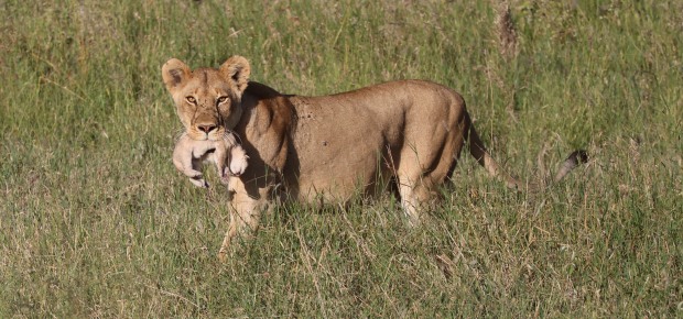 A large male surveys the Serengeti from a kopje in the morning light. A young Leopard guards a wildebeest calf kill in his tree. A llioness emerges from the grass with her new born cub.