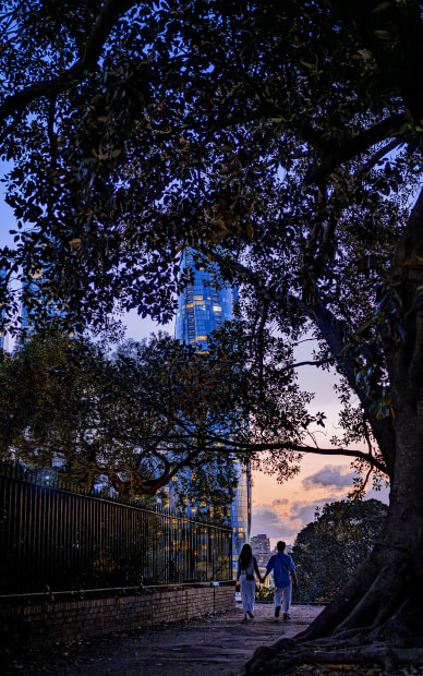 [Humanistic Landscape] Under Sydney's golden dusk, a couple walks hand in hand in dappled shadows, where nature and the city tenderly embrace.