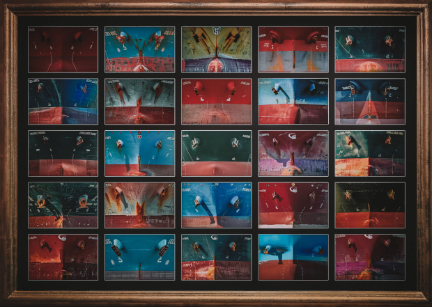 This work is a composite of 25 ship portraits taken over a period of several months at Birth ADL IH M on the Port River in Adelaide. Ships docking here deliver petroleum products to a storage facility. I used the app MarineTraffic to find out when a new ship had arrived. What really interested me about these ships is that they were all different - colour, name, Flag state, shape, and markings. The individual portraits have been edited and arranged to emphasise this - like a series of trading cards. I stopped documenting the ships’ log once a previously photographed vessel arrived. My approach has been to make this work decorative as well as informative. The frame is a separate photographic element taken from a large ornate mirror to complete the vintage maritime theme.