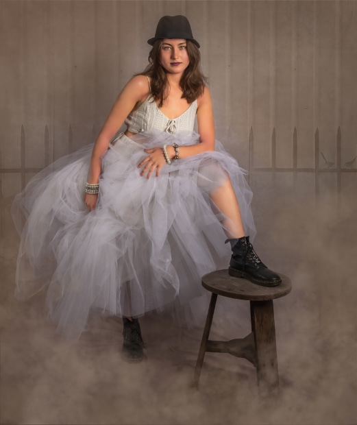 Recently, I got together with a few friends to organise a day of studio shooting to test the new lights I had just purchased. One of them organised a young friend to model for us. We had a lot of fun playing with both the lights and the props. I’ve then done some creative editing in Photoshop to end up with this image I’d had in mind. I blended in a photograph I took of a painted fence to create the spiky fence behind her. I then added the smoky effect, done with a brush I made from a cloud image to create the smoke There’s more than one reason I called this image ‘Smokin’!