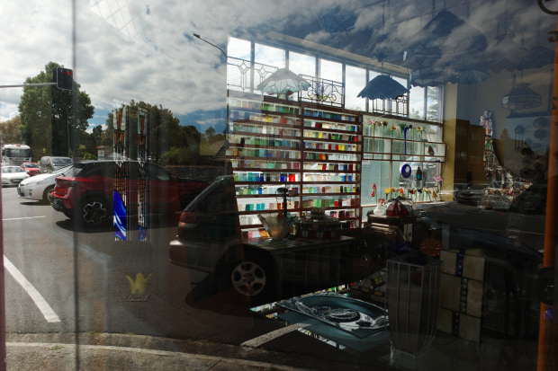 A shop encountered along the roadside in New Zealand. The street, parked cars, and interior objects overlap through reflections on the window surface. Photographed in 2025.