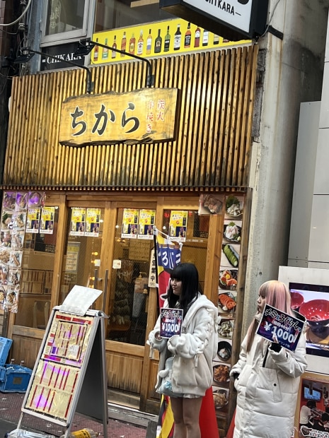 Recent trip to Tokyo in winter we were filling in time until the King Kong show and slipped away from guide, not typical tourists. In this street saw all these girls with signsand they were inappropriately dressed for winter. High heeled boots, short skirts and thick jackets - good subjects for street photography, they kept turning away when they saw my camera. Cat and mouse game until got some photos. Finally worked out they were prositutes and advertising their "massage facilities."