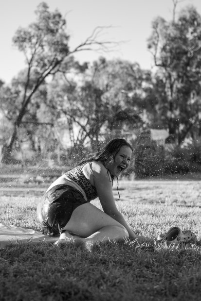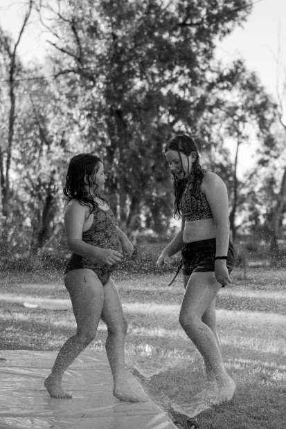 Two sisters making the most of hot summer day, cooling off under the sprinkler. Soaked, laughing, and enjoying the simple life out bush.