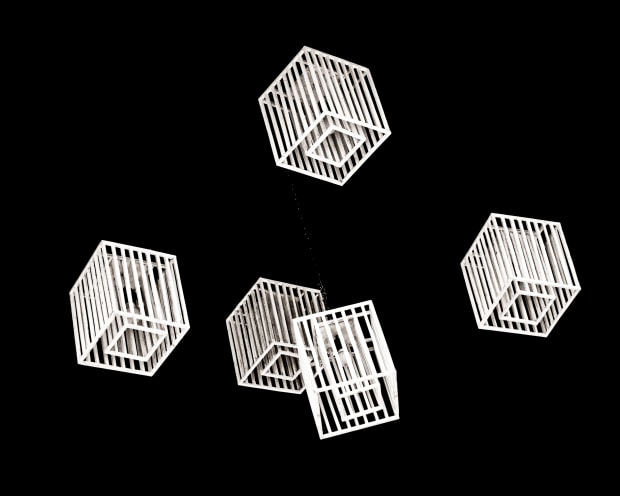 This image captures a mesmerizing display of light fixtures seemingly floating in the darkness, their warm glow casting an ethereal ambiance. Suspended by nearly invisible wires, they hover like delicate stars, their shape suspended in time.