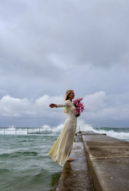 A woman stands poised in her wedding dress, on the edge of the ocean, ready to take the plunge.