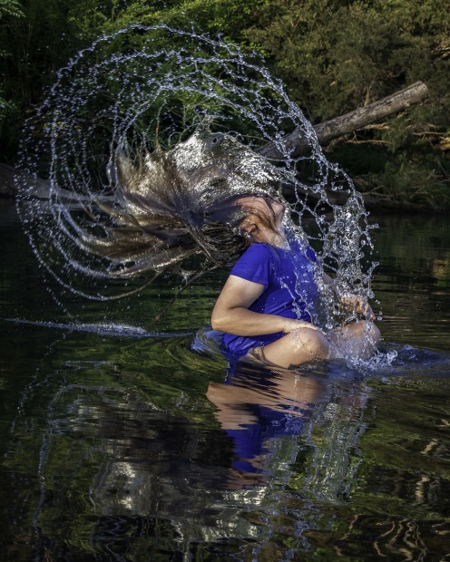 A perfect arc of water captures the energy of the moment as her hair is flipped back. The carefree and delightful fun of being at play in nature.