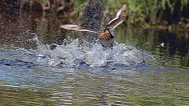 My local lake is thriving with activity during Spring and early Summer. Not only is breeding season in full swing, you also see territorial battles take place. On this occasion, the Hardhead Ducks were with their offspring but little did they know that floating underneath the water was a little Australian Grebe who was swimming underwater preparing to deliver a short and sharp nip. This shot represents the exact moment when the Hardhead feels the sting and gets ready to depart and move to another location.