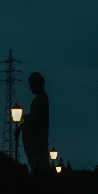 A unique perspective of Ushiku Daibutsu from a local shopping centre in the Ibaraki region in Japan. The unique perspective showcases how we can capture some creative perspectives by utilising foreground elements with the subject. The specific shot here uses the lamps as a foreground element, and the unique perspective gives off the impression that the statue is lighting the lamp