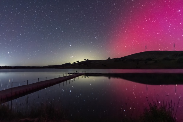 Aurora Australis and the night sky filled with pink streaks at Carcoar Dam in the Central West, NSW, Australia. 12 November 2025.