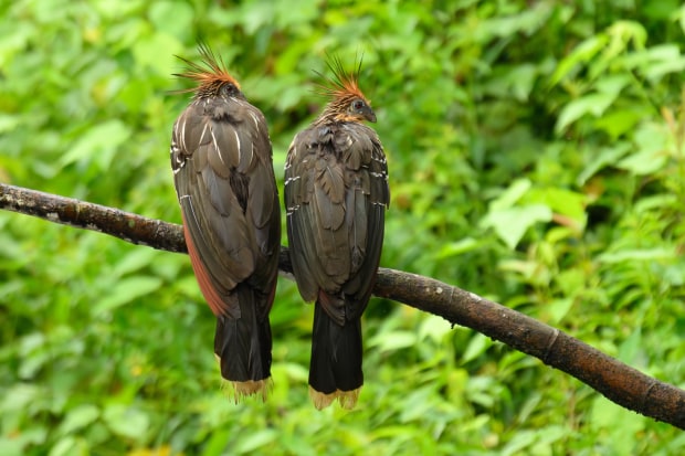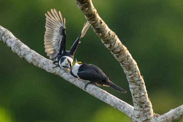 These photos capture birds in pairs in a range of behavioural situations. the Galapagos Penguins were playing, the White-necked puffbirds were fighting and the Hoatzin were resting on the branch but watching and aware of all goings on around them.