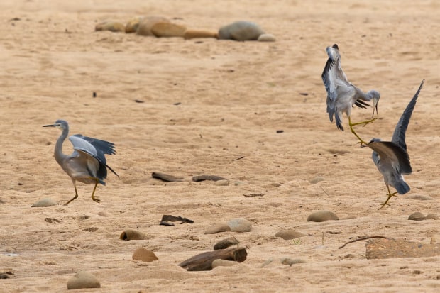 Three White faced herons landed on the beach and it was obvious that one was not welcome. One walked away and left them to battle it out.