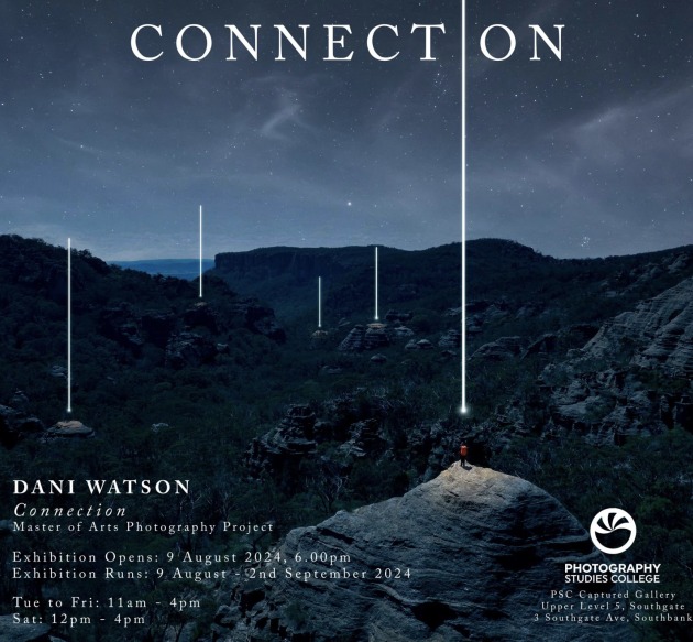 Connection is a solo exhibition that is the outcome of Dani Watson’s Master of Arts Photography project undertaken at Photography Studies College (PSC), Melbourne. The exhibition incorporates new technologies, serving as both a personal exploration and a broader commentary on the changing dynamics between humans and nature.